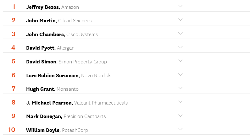 So what’s the ultimate takeaway from this ranking? In many ways, Bezos’s place atop the list says it all. Here’s a CEO who has frequently underperformed in the short term while continuing to make big bets on the future. Amazon often reports quarterly losses, even as sales continue to rise. And though the company is subject, like many firms, to dramatic share-price swings, Amazon and Bezos have a long-term track record of delivering shareholder value that is second to none.